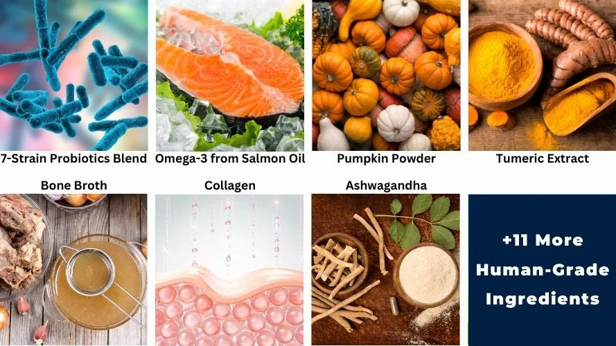 It works by giving your dog powerful ingredients like probiotics, omega-3s, turmeric, hyaluronic acid, collagen, bone broth, pumpkin powder and more.